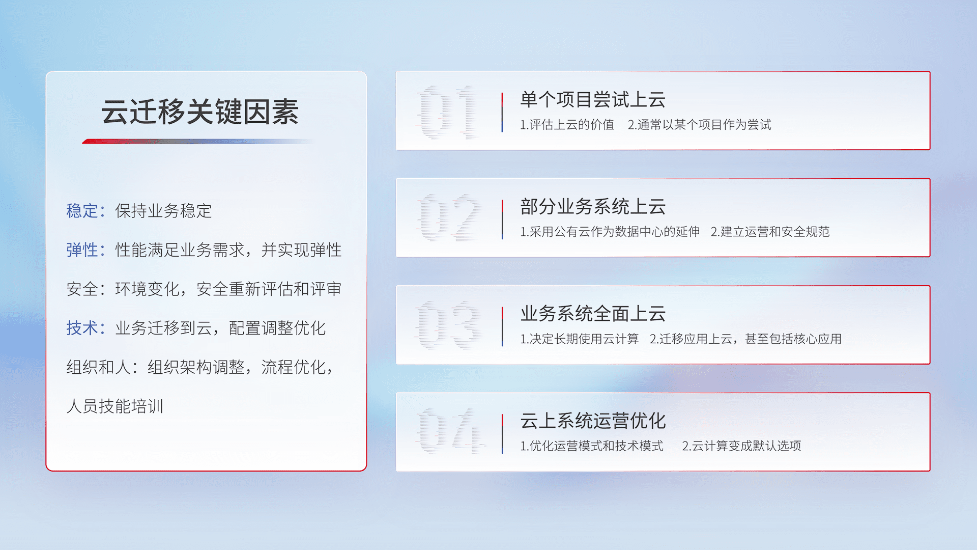 结合实际业务,,从规划设计、、、云平台选型、、云原生改造、、、、数据迁移、、、集成交付,,迁移全过程为客户识别最佳上云路径,,做好风险识别管理,,,,设计网络架构、、、身份权限、、、安全审计合规、、操作审计、、、、日志审计、、监控告警策略、、、多站点容灾设计等,,对云上基础设施进行整体规划,,,提升IT治理水平,,,,以满足弹性、、、高可用、、高性能的需求。。。。