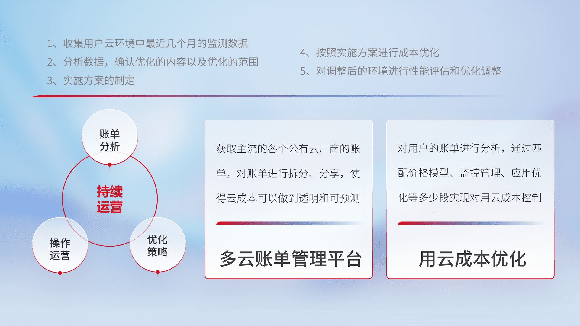 通过多云纳管,,,,以统一的资源数据模型把客户的云资源进行抽象和封装,,,,进而实现对多云资源的统一操作,,保障云资源管理的可靠性、、、稳定性与可用性。。量身定制化运维内容,,,配置、、开发运维、、补丁管理、、备份、、、监控、、认证和访问管理、、、审计和日常巡检等,,保障在用云过程中的可靠度,,,稳定度以及高可用率。。。。